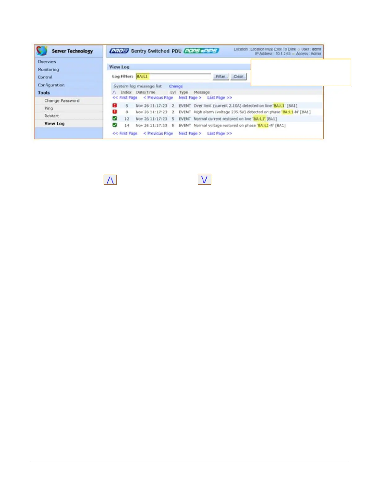 This example shows the filtered results of the system log (highlighted in the example) filtered by “BA:L1”.