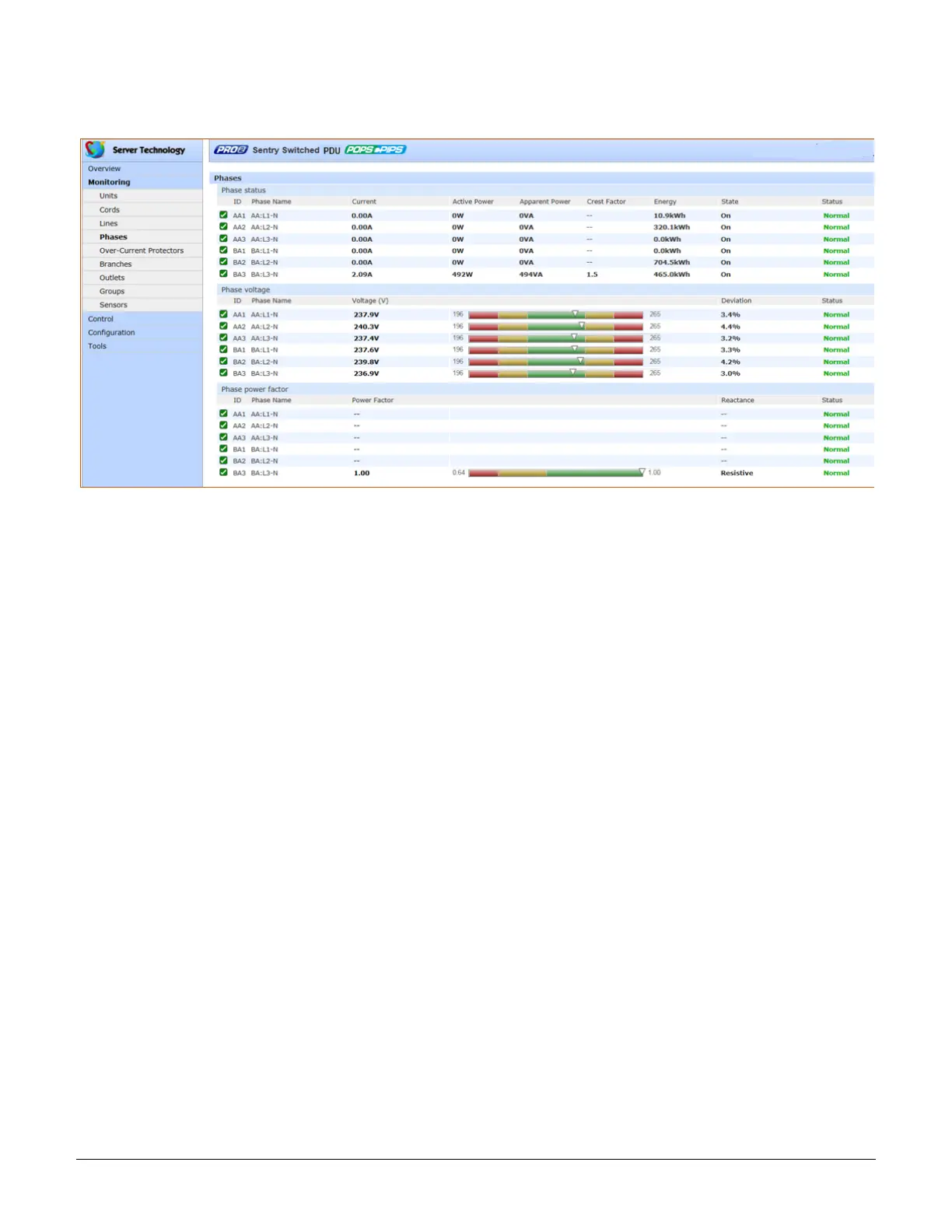 The phase status, voltage status, and phase power factor should be Normal, and the phase voltage and power