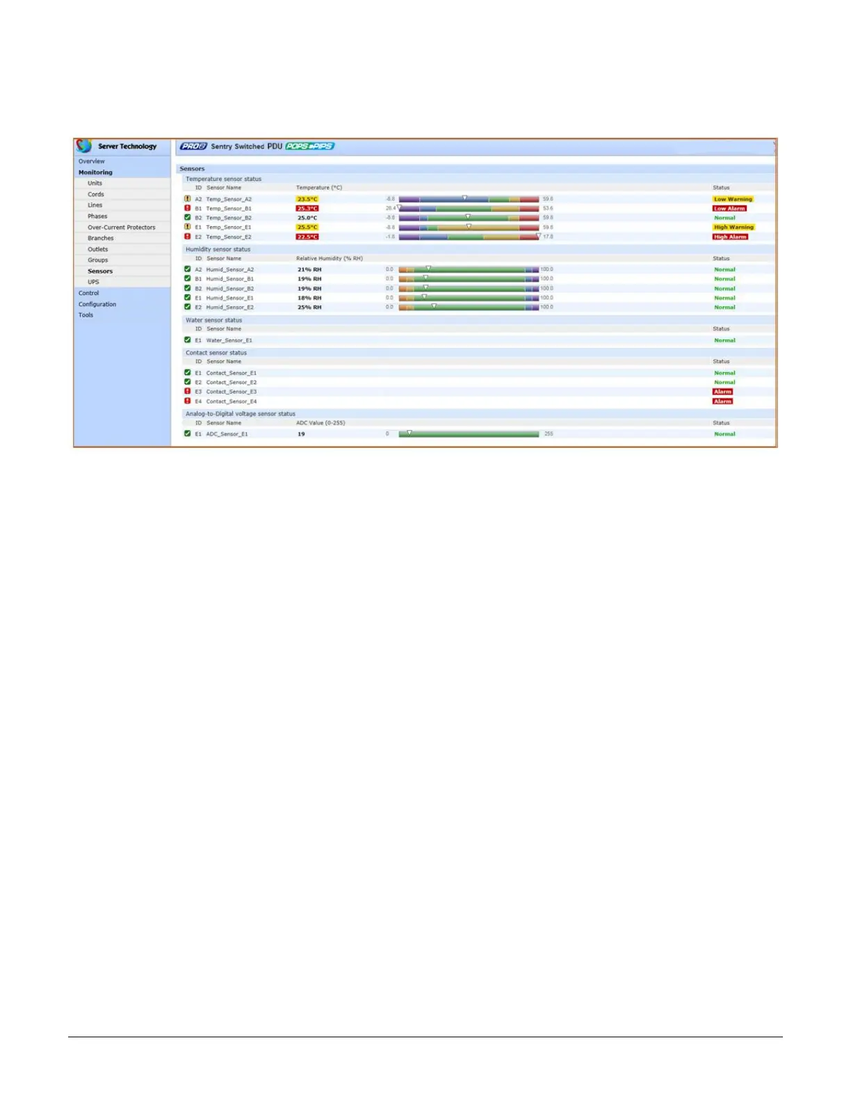 The operating status of all sensors should be Normal and operating within defined thresholds. View the color-coded