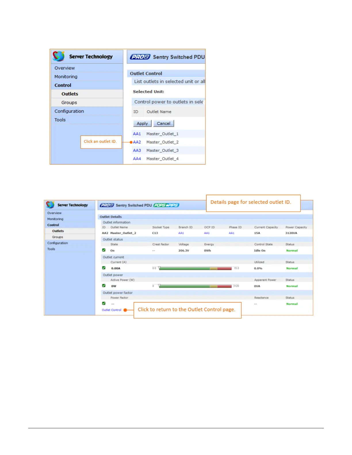 1. From the Outlet Control page, click the Outlet ID link for any outlet in the list, such as AA2 in this example.