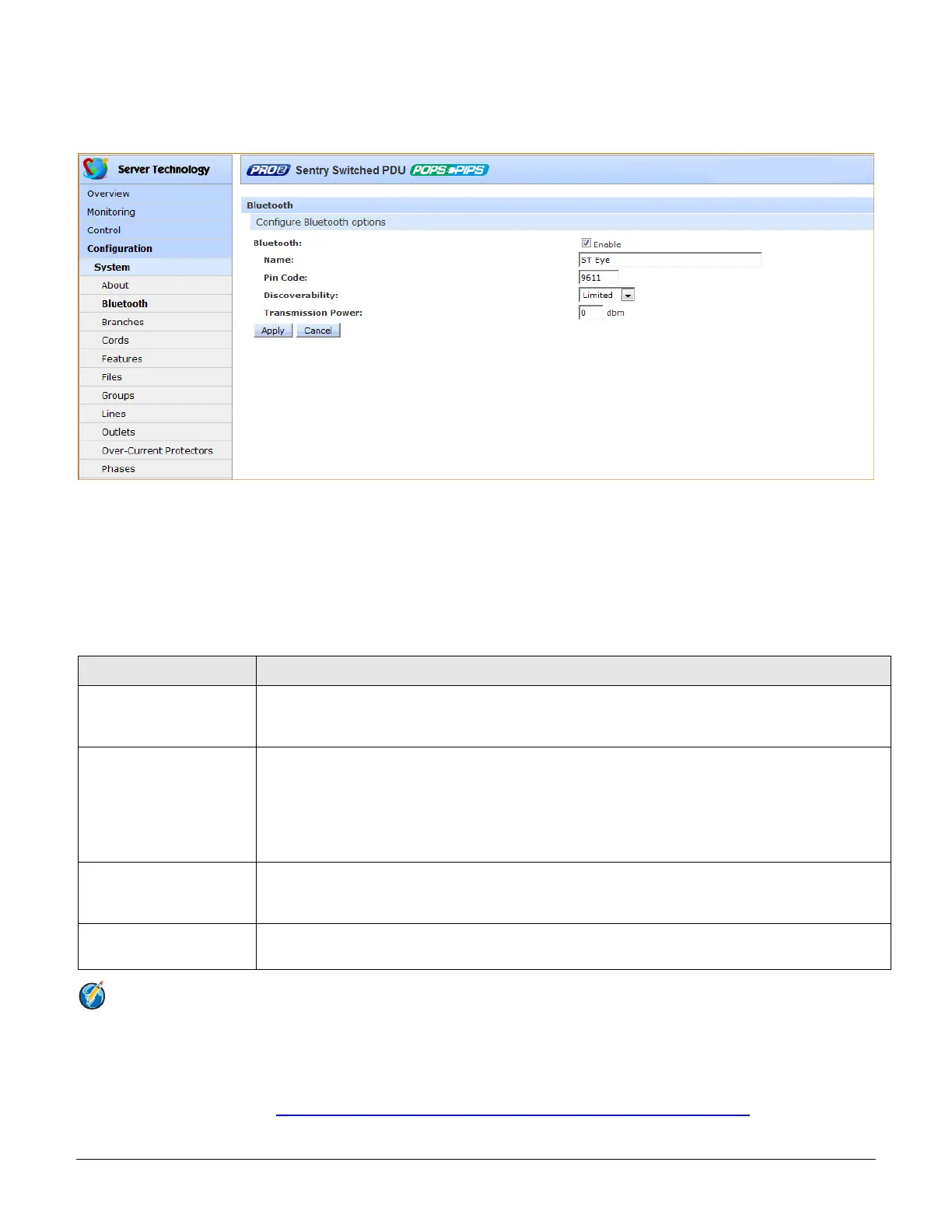 2. Provide a value for the Bluetooth parameters: name, pin code, discoverability, and transmission power, as