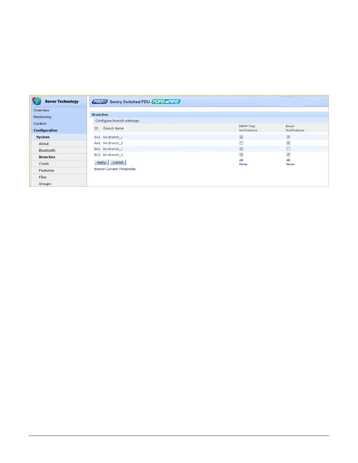 The Branches page provides the Branch Current Monitoring feature of the PRO2 to support up to six branches to