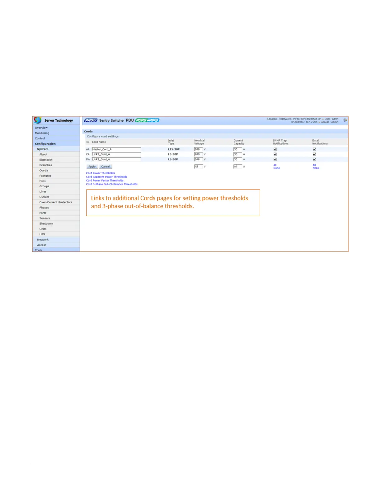The Cords page also sets SNMP Trap and Email notifications for cord events.