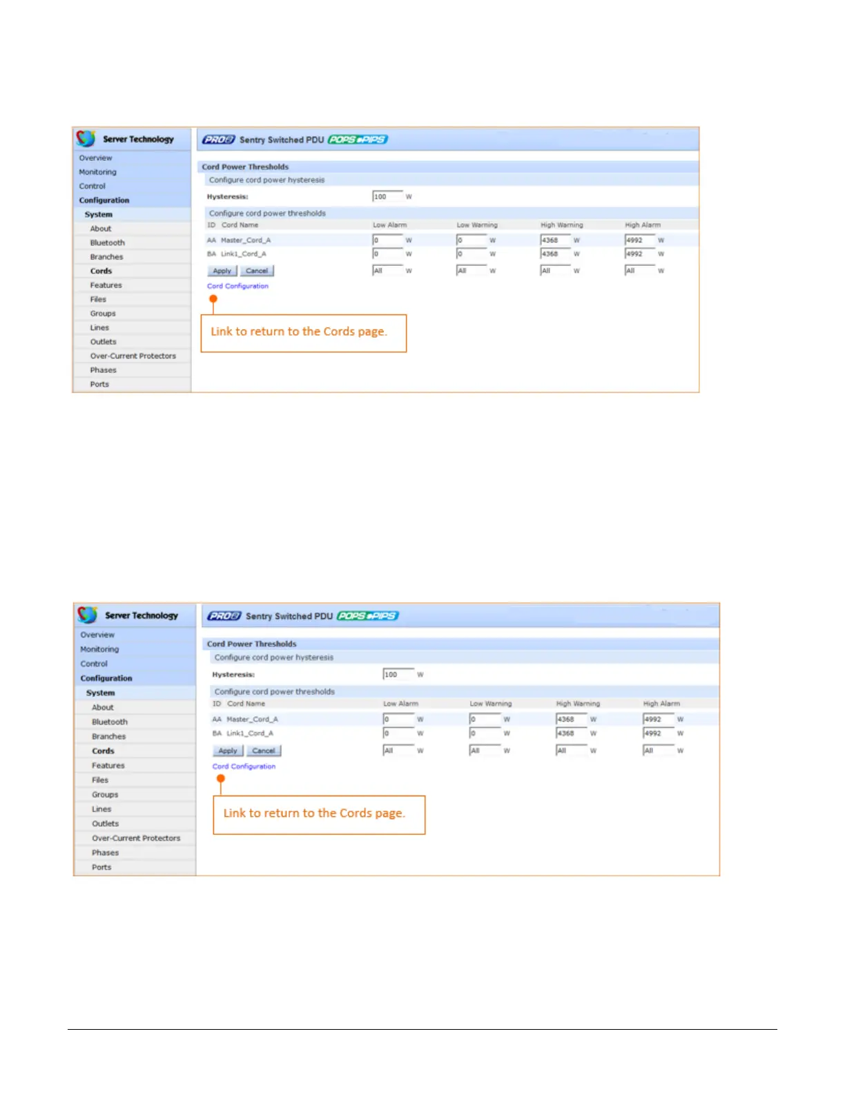 Click the apparent power thresholds link at the bottom of the Cords page to display the configuration page: