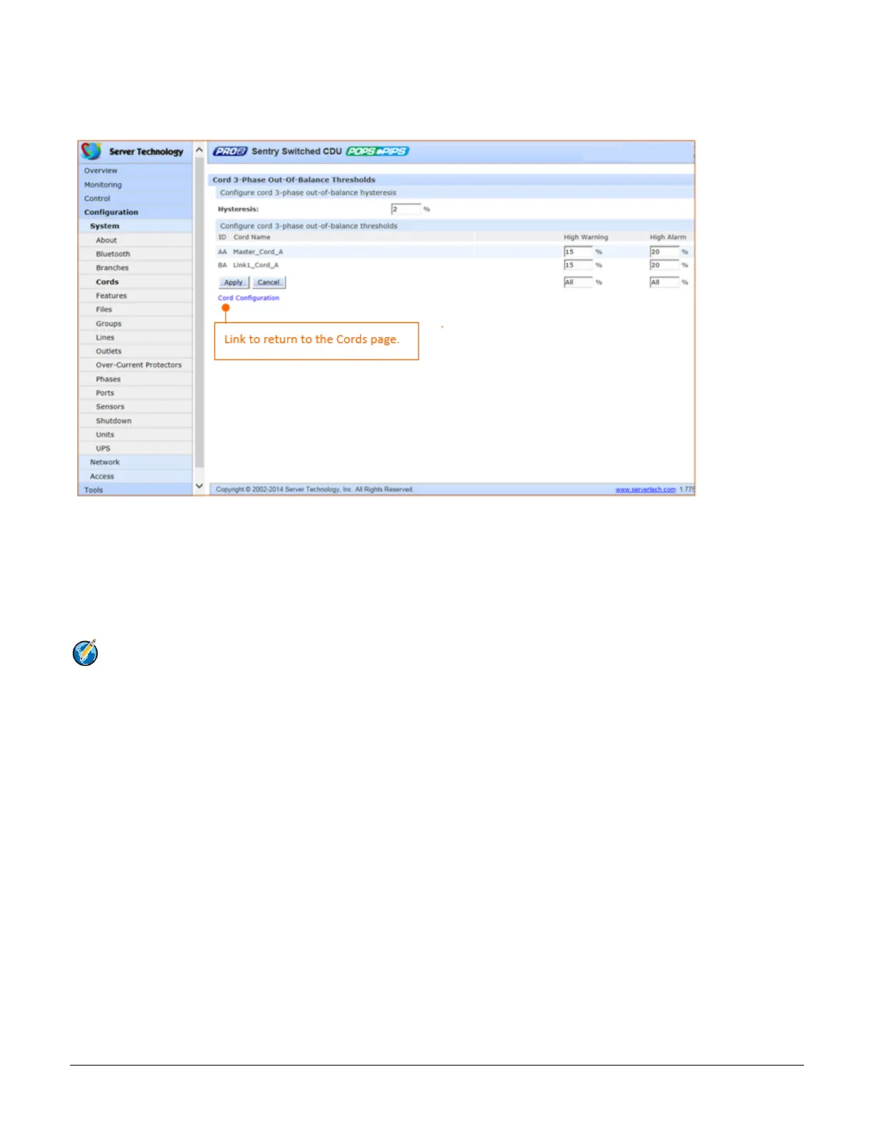 Click the out-of-balance link at the bottom of the Cords page to display the configuration page: