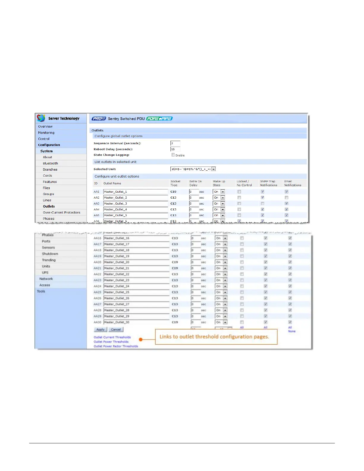 The Outlets page allows configuration of global outlet parameters and outlet shutdown options, including the