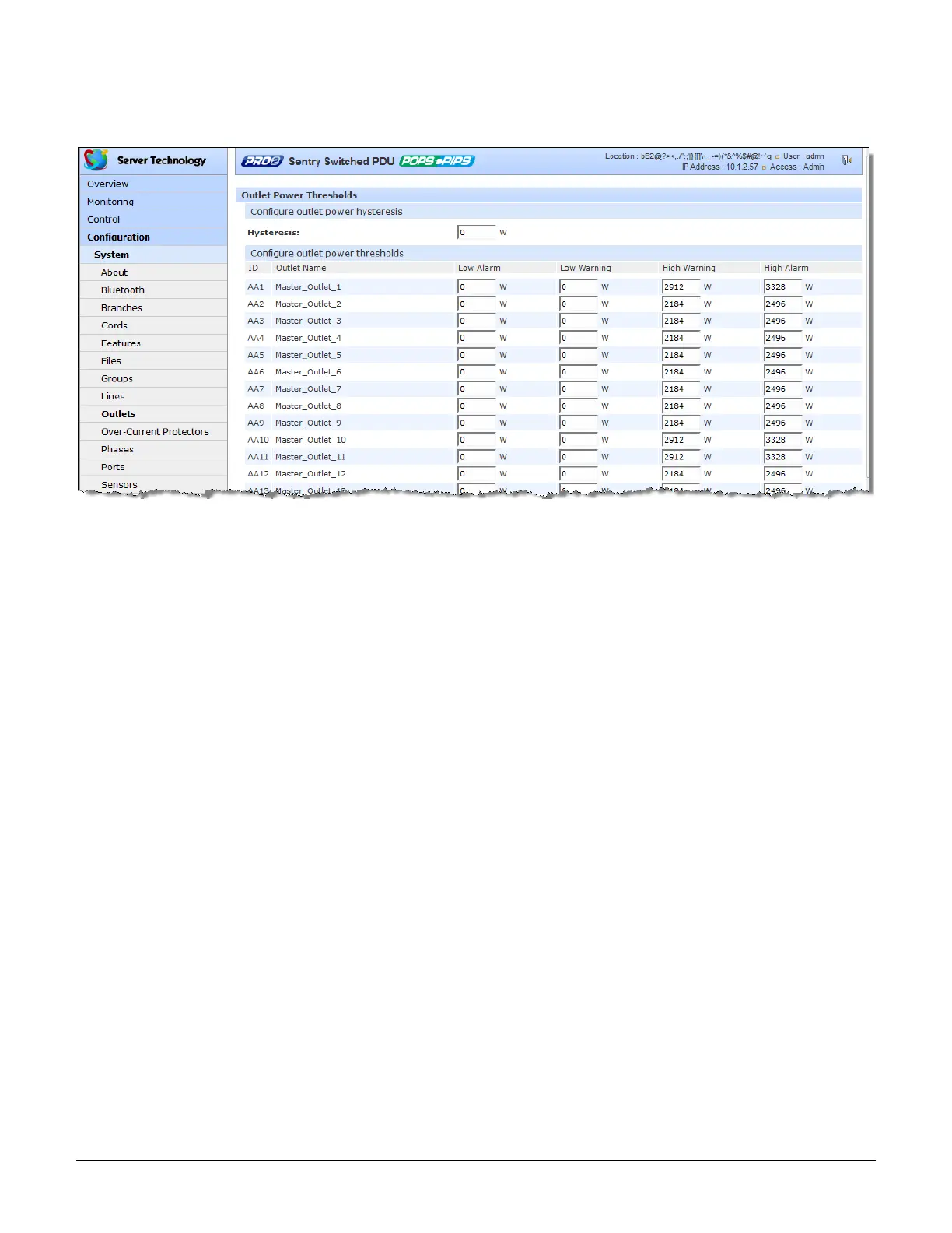 Click the outlet power thresholds link at the bottom of the Outlets page to display the configuration page: