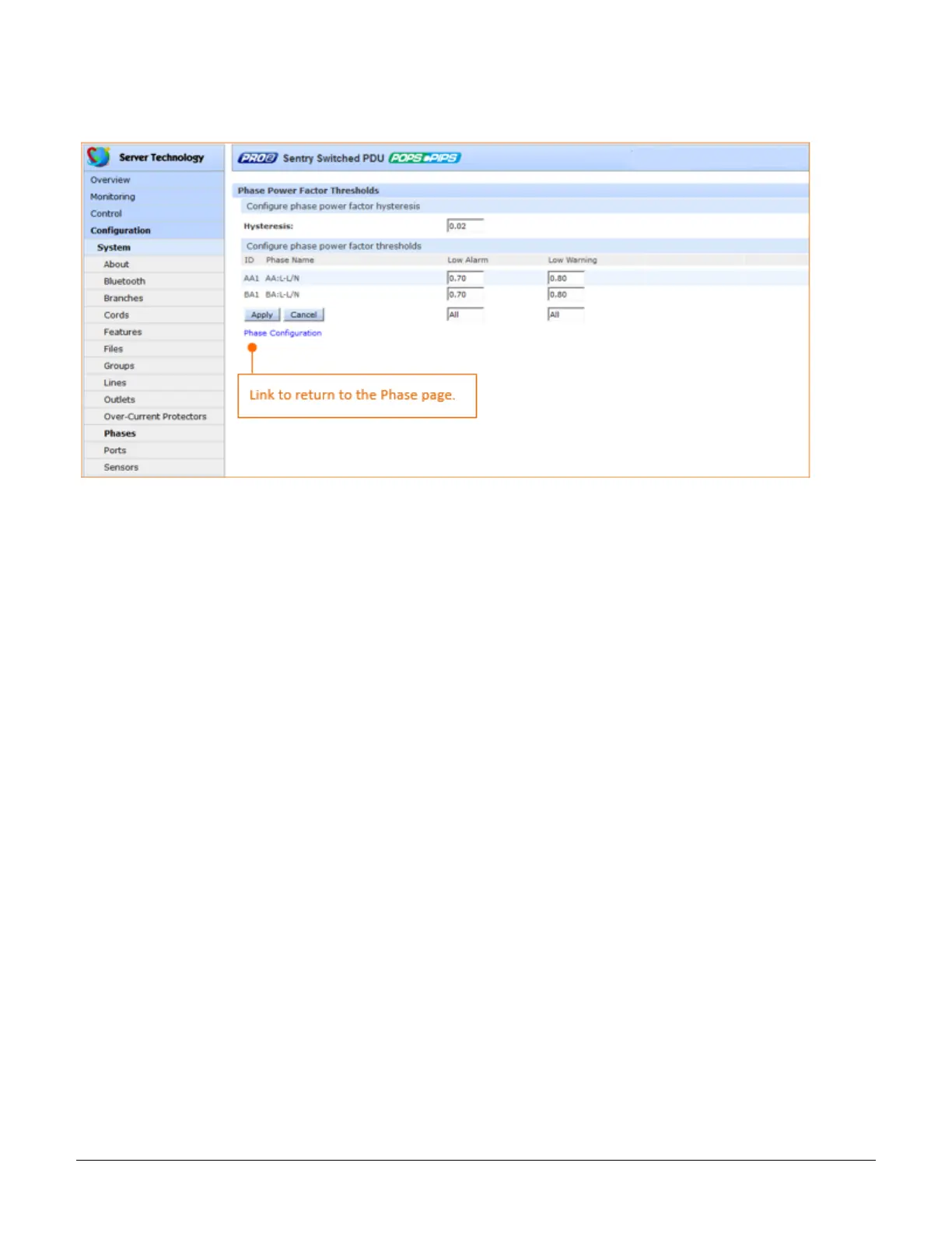 Click the phase power factor thresholds link at the bottom of the Phases page to display the configuration page: