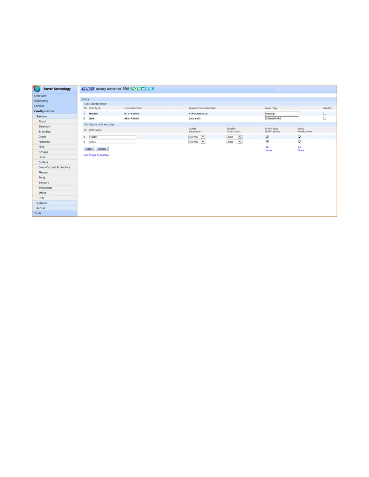 determines outlet sequence, and sets the display orientation of the mounted unit. The page also sets sets SNMP