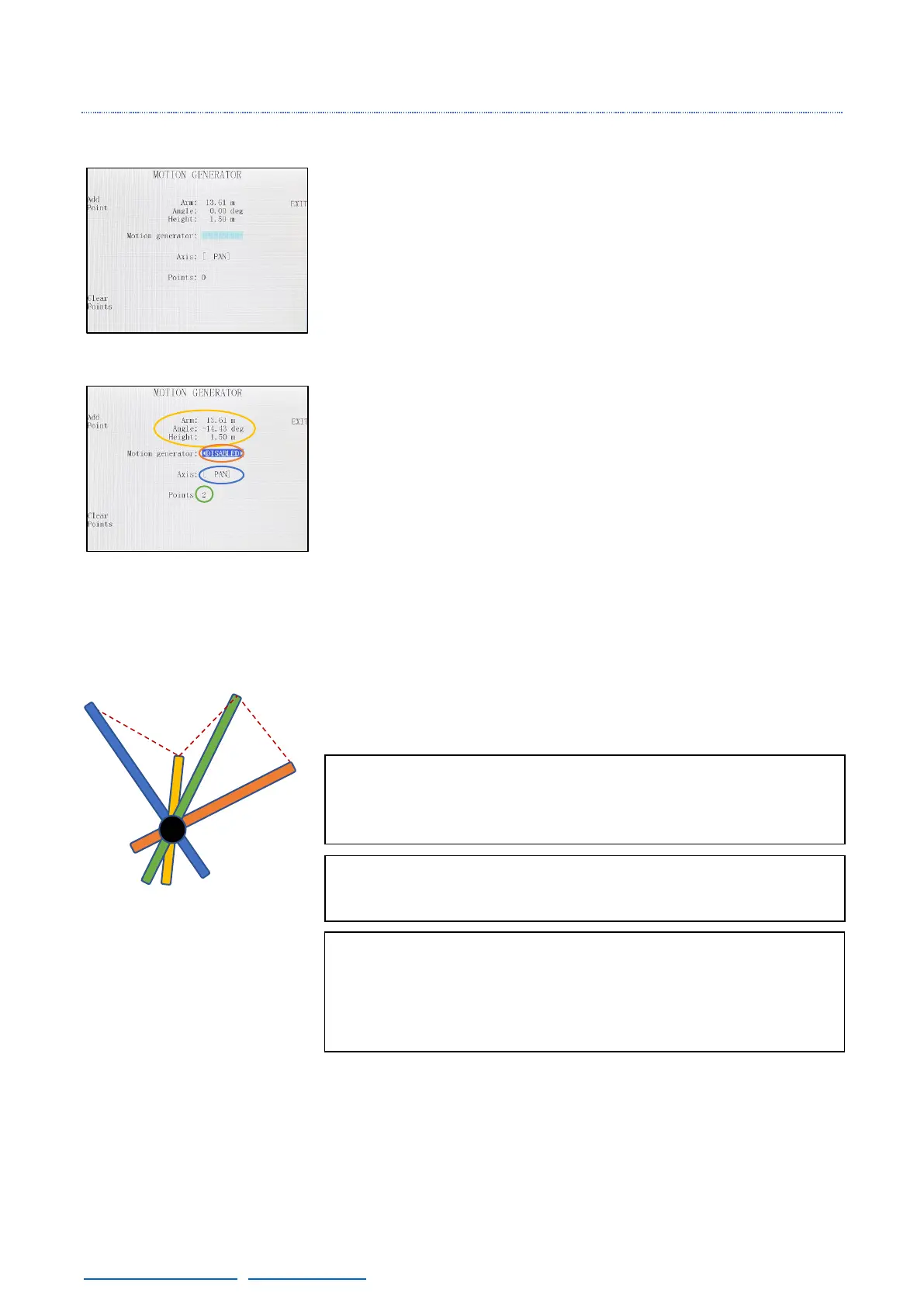 the arm movement. If the Pan axis is selected, set the Tilt the arm to