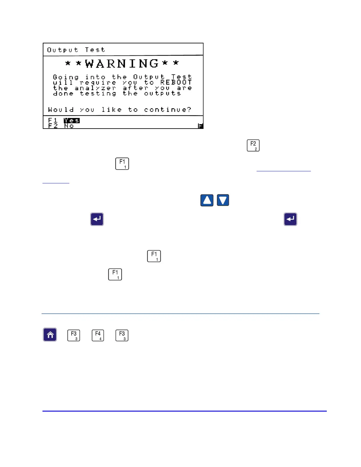 To exit the Output Test screen and proceed with normal operation press . To continue to the