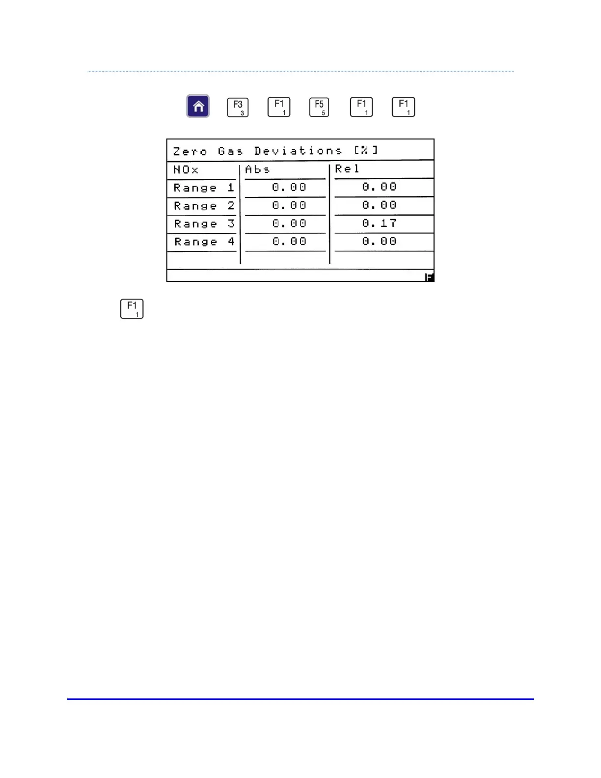 Press from the Manual Deviations menu to view the Zero Gas Deviations screen.