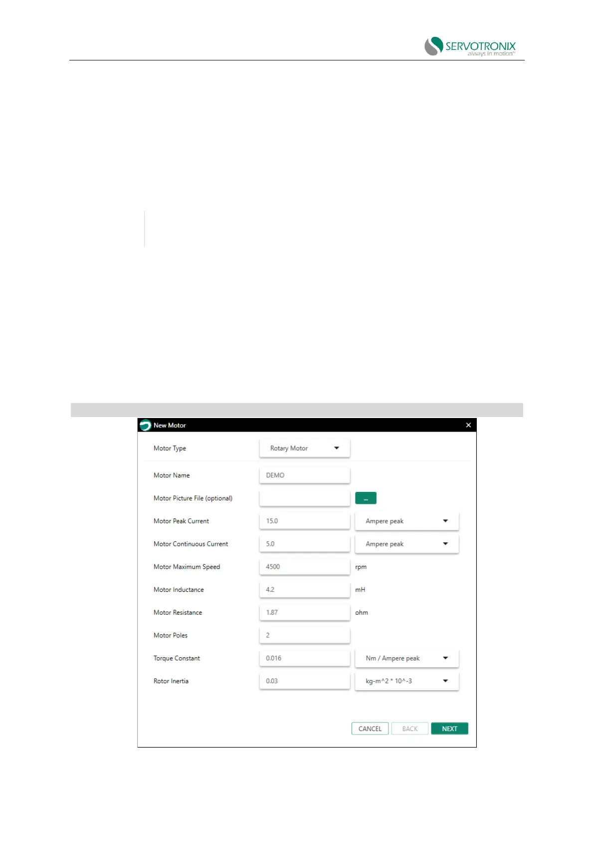 in the motor data table. In addition, the wizard includes