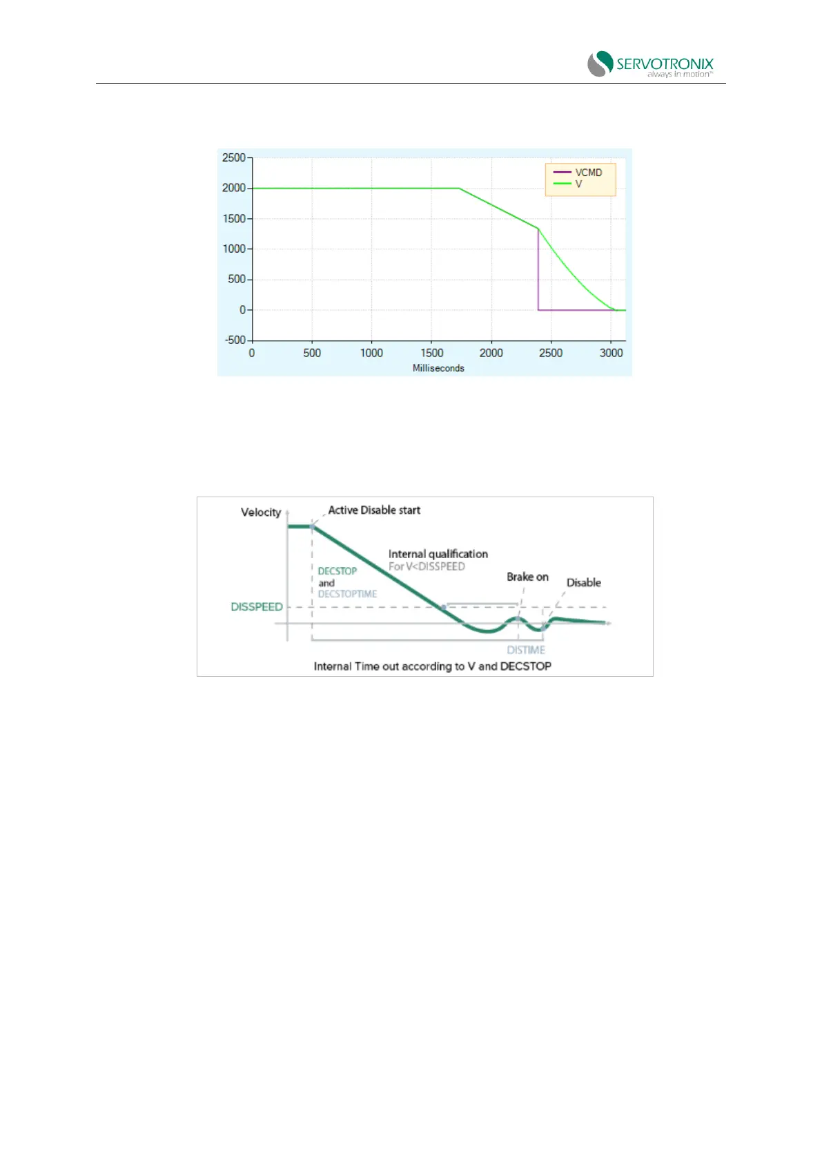 The velocity command will be set to zero immediately after the drive is disabled. The actual velocity