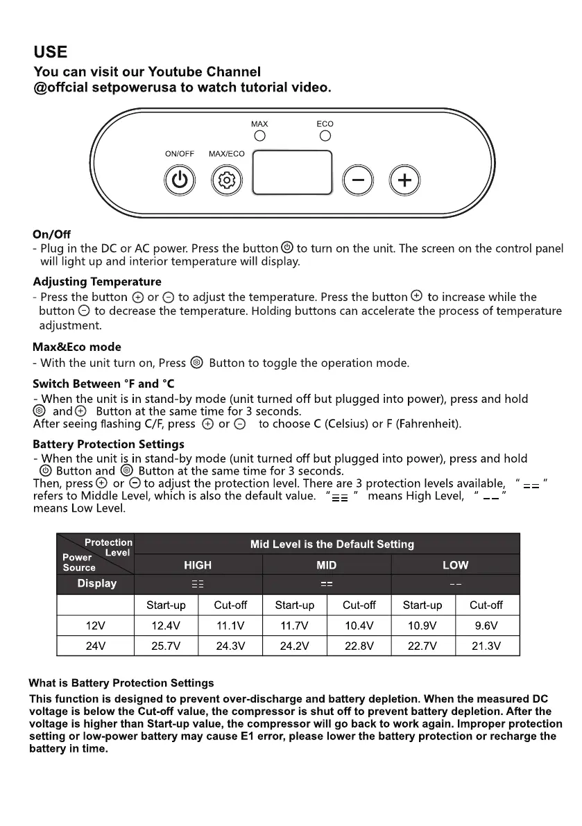 SetPower AJ Series - Using the Refrigerator; Powering On and Off; Adjusting Temperature Settings; Battery Protection Settings