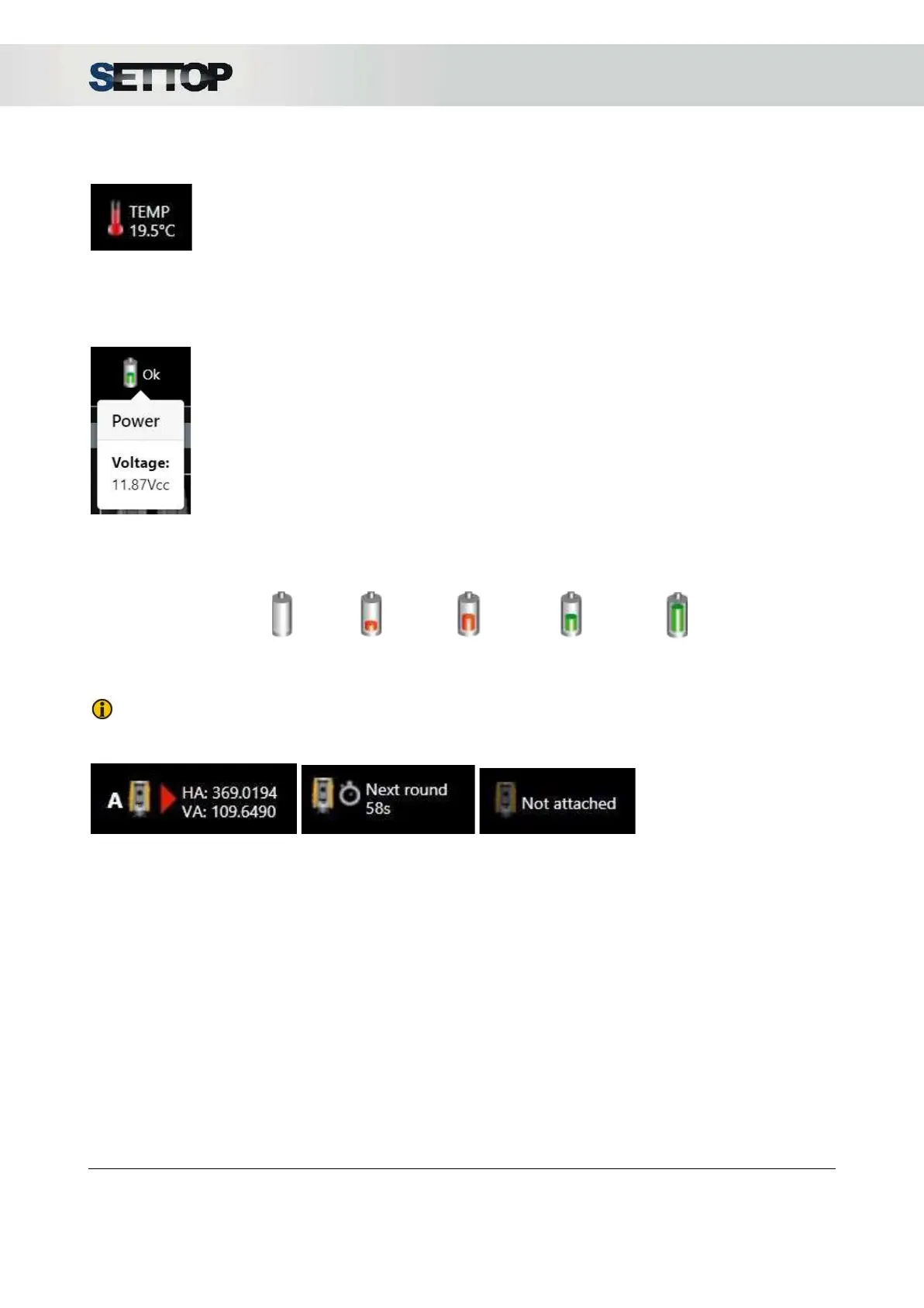 The battery symbol indicates voltage level received for the receiver. Pressing on the icon a drop-down
