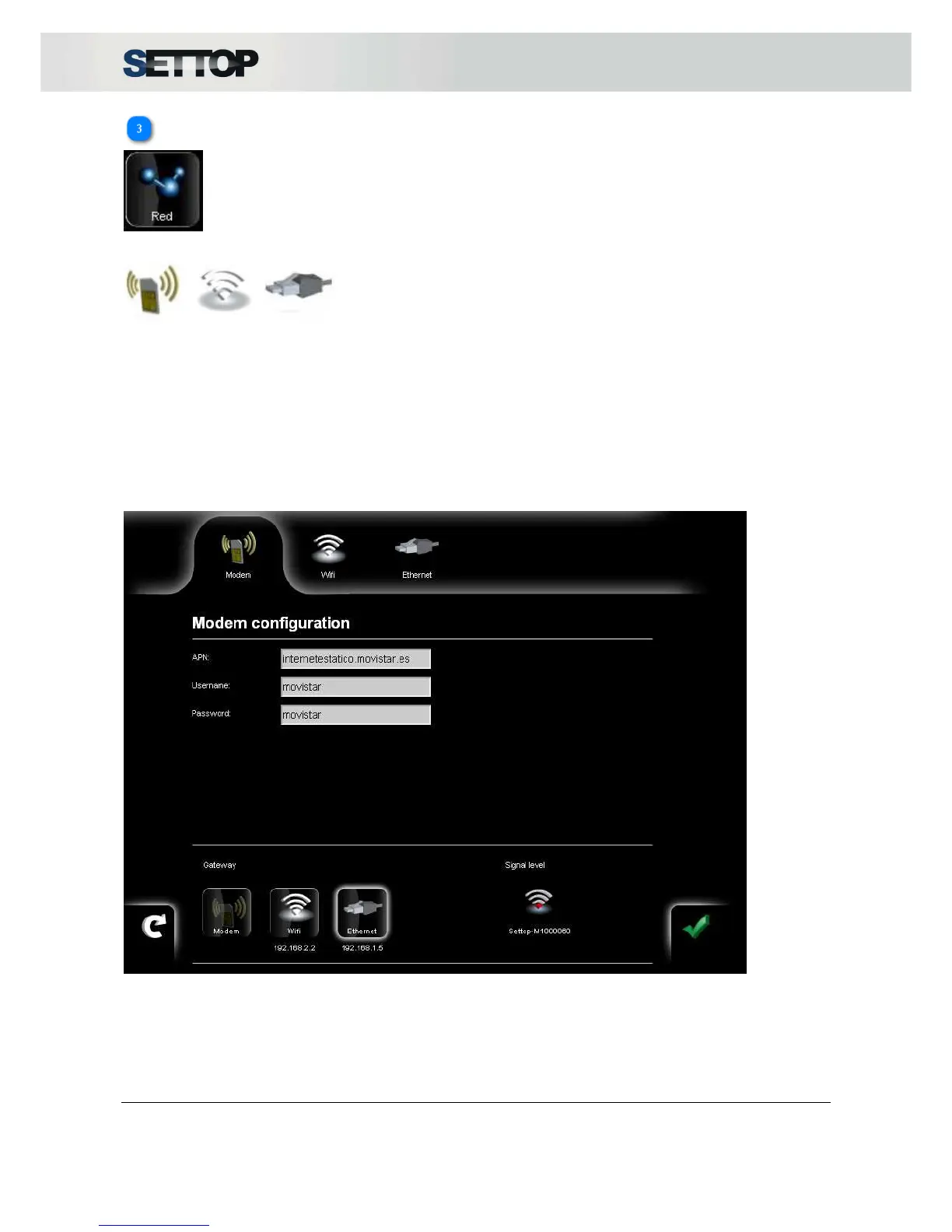 Network configuration has three interfaces that appear in the top horizontal bar, Modem, Wi-Fi, Ethernet: