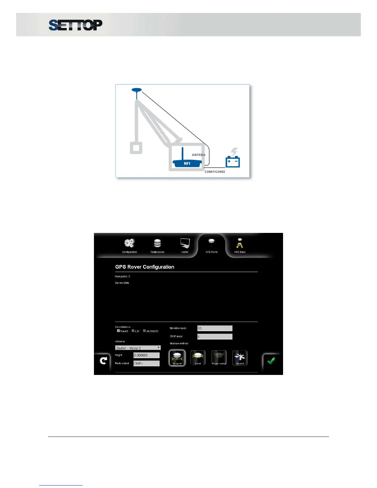 GPS antenna position to be on top of the vertical boom crane. Also, the Settop M1 must be powered by an
