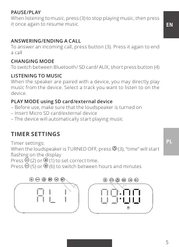 To switch between Bluetooth/ SD card/ AUX, short press button (4)