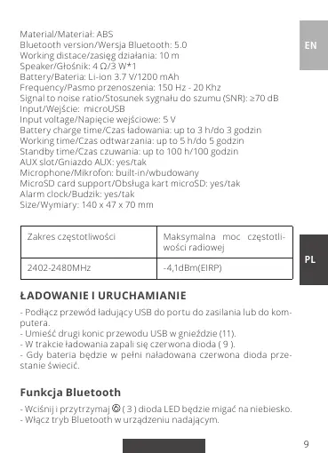 Bluetooth version/Wersja Bluetooth: 5.0