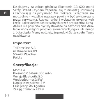 Dziękujemy za zakup głośnika Bluetooth GB-600 marki