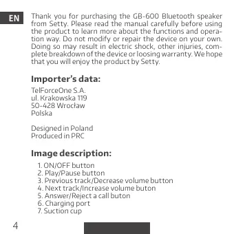 Thank you for purchasing the GB-600 Bluetooth speaker