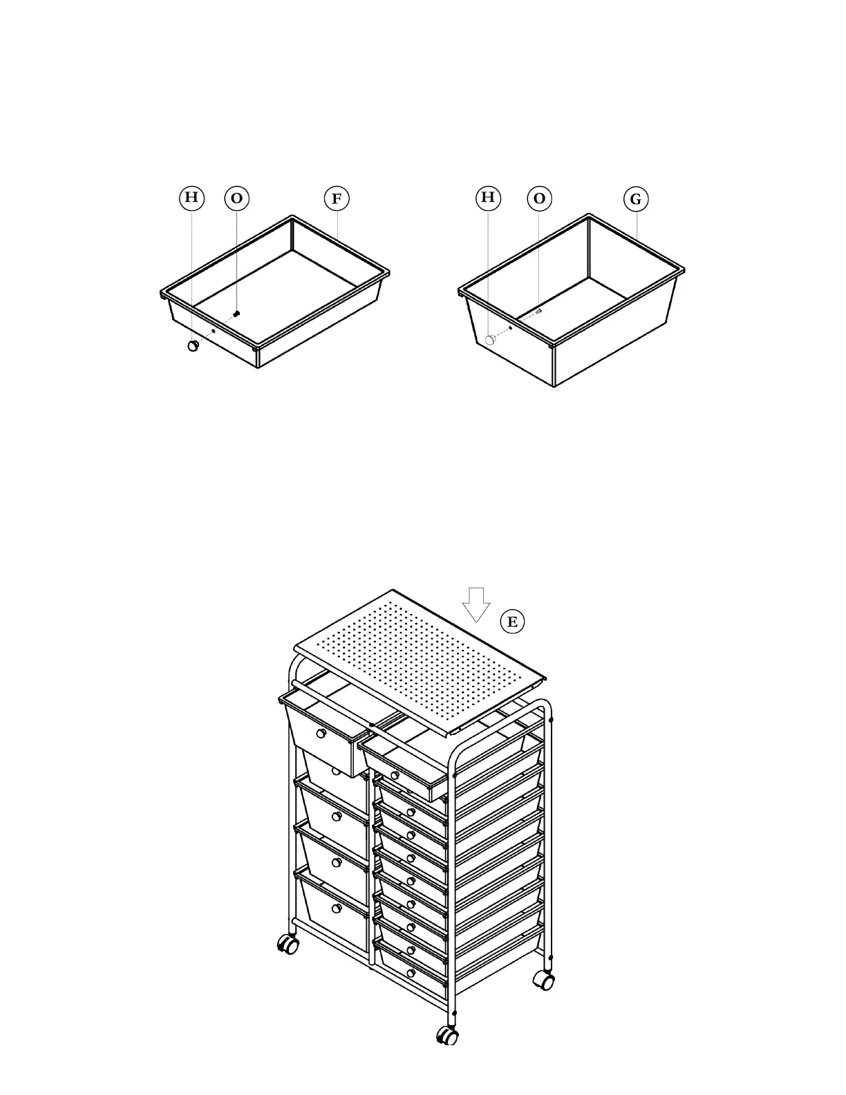 Clip on SHELF (E) to crossbars. Insert DRAWERS (F,G) into guides carefully.