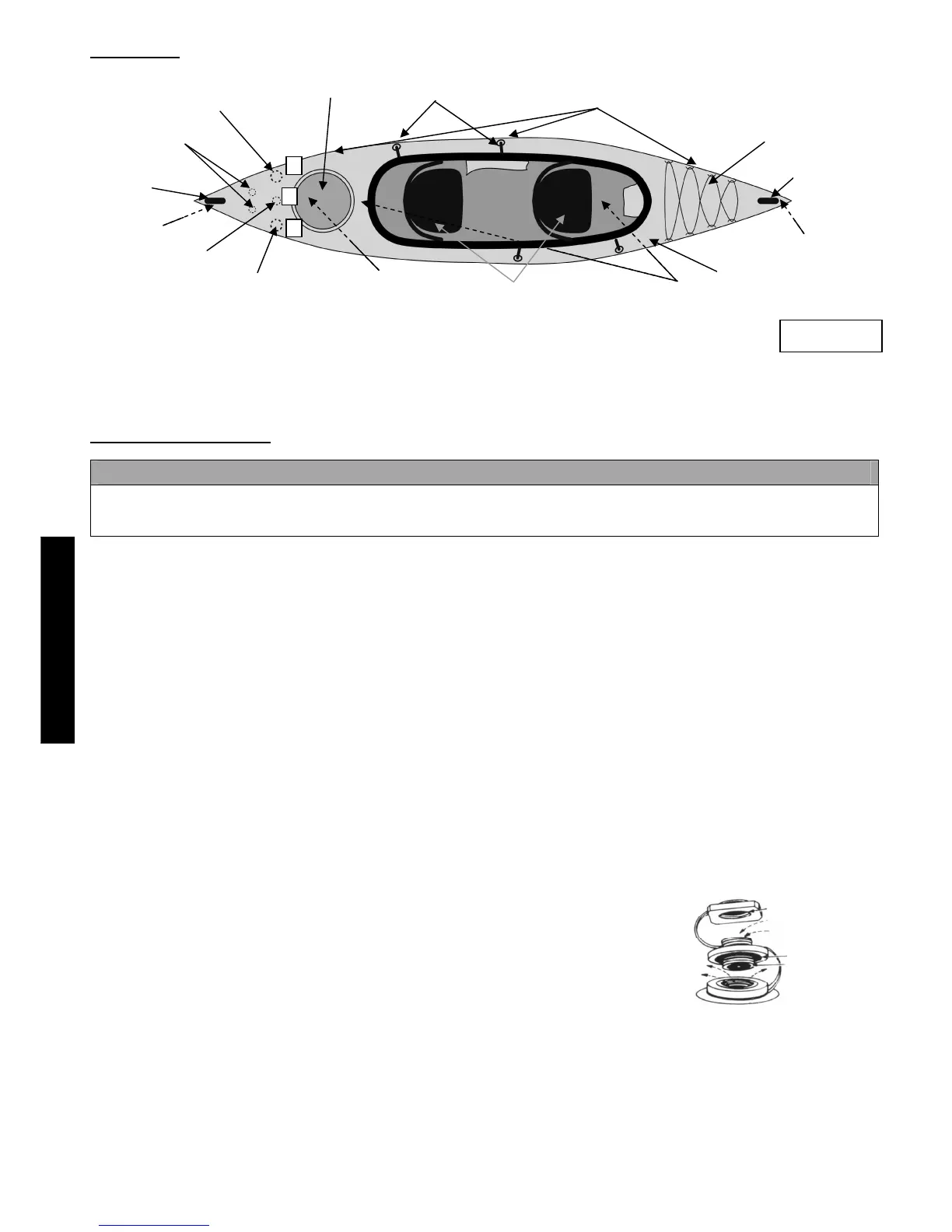verhoging bevindt, moet naar de voorkant van de kajak wijzen; dit is belangrijk want de uiteinden zijn schuin afgesneden