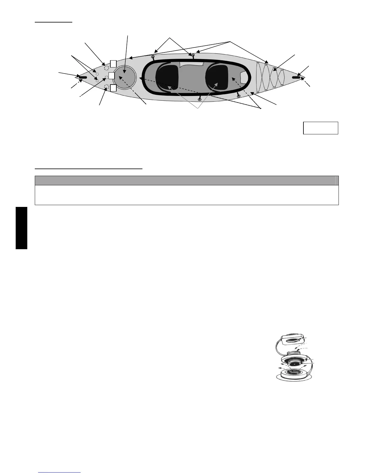 Introduceţi dispozitivul semirigid din plastic negru, care v-a fost livrat împreună cu caiacul, în locaşurile care se află sub