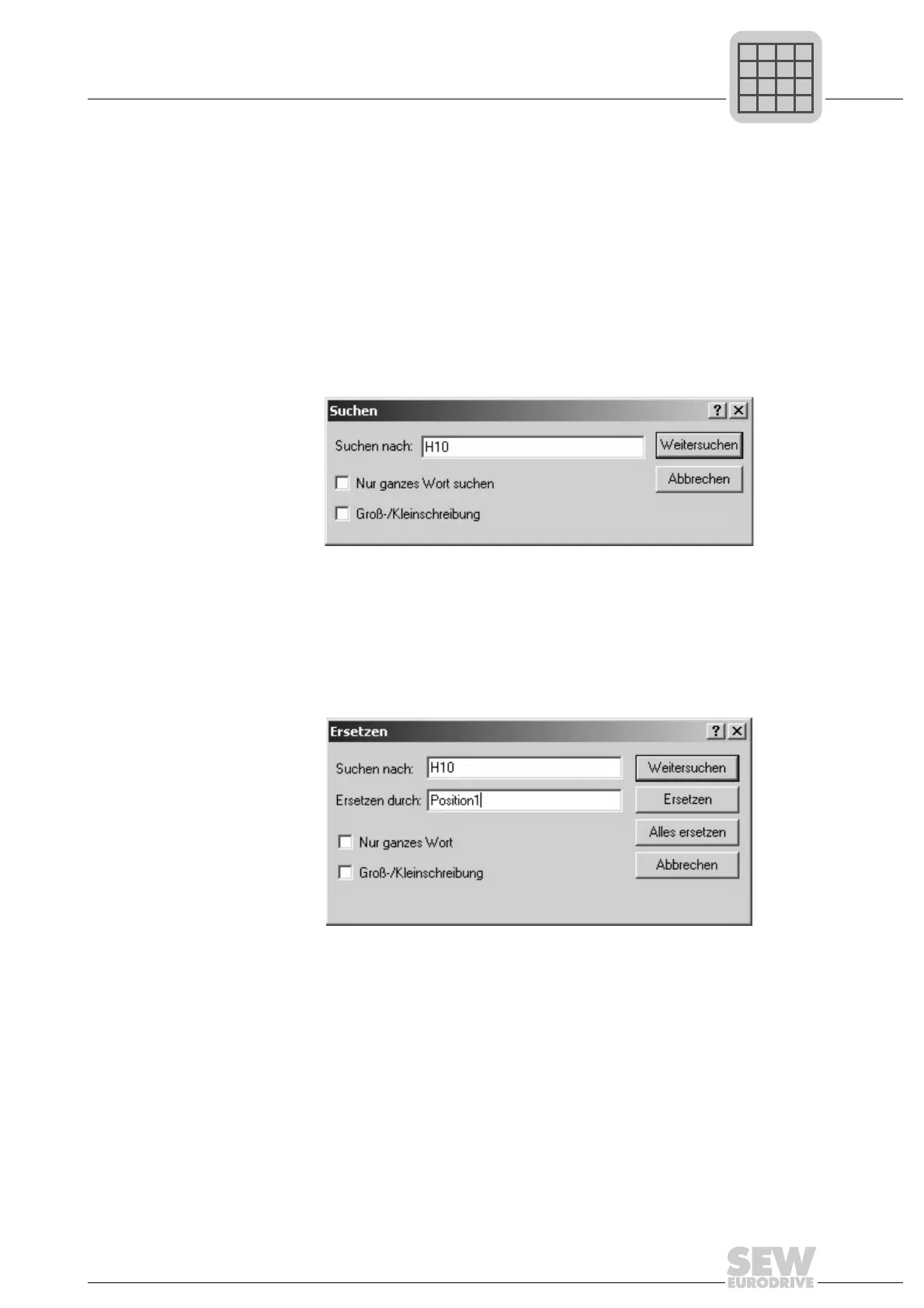this text will be used as the search string (in the following screen this is "H10"). The fol-