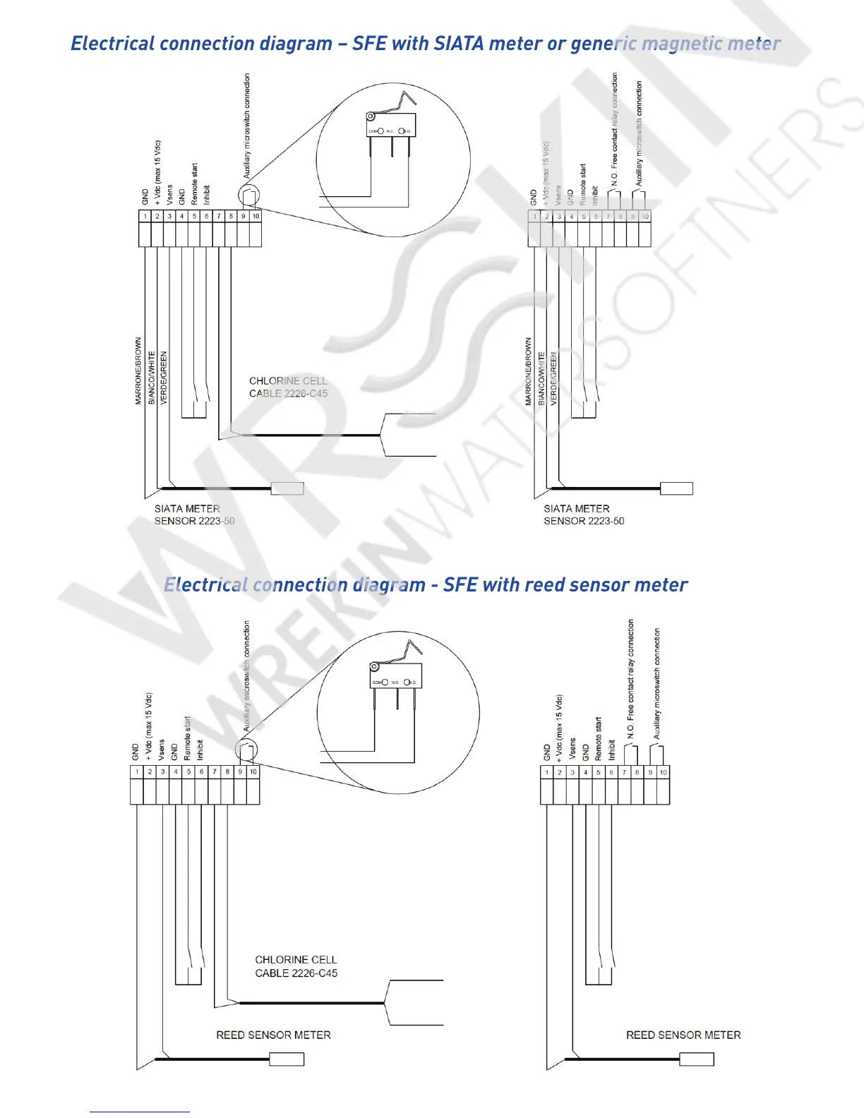 SFE SIATA - Electrical Connection Diagram - SFE with SIATA Meter or Generic Magnetic Meter; Electrical Connection Diagram - SFE with Reed Sensor Meter