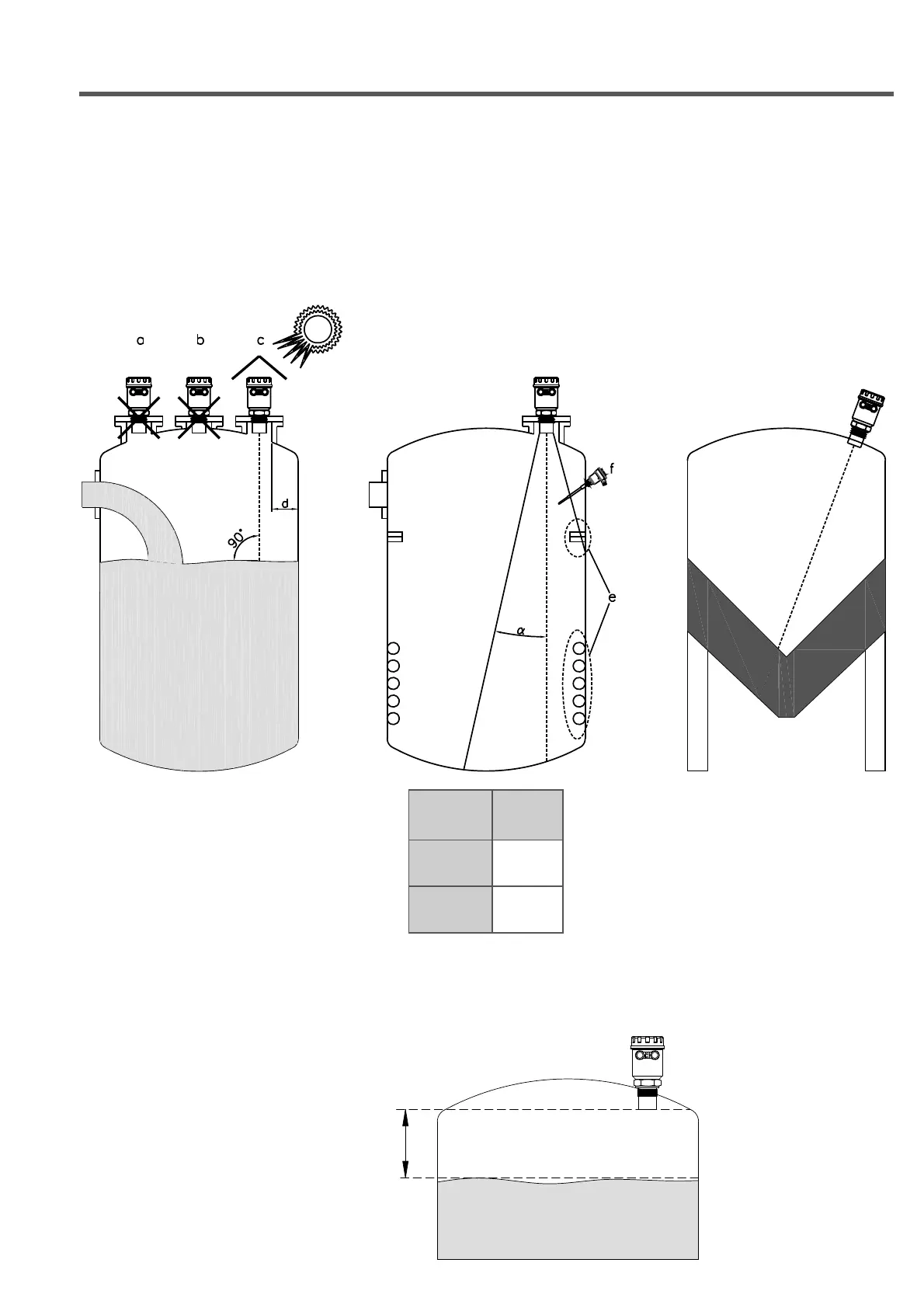 - With cambered roof, Do not install the sensor in the tank center (b). Leave a 300mm (d) minimum distance