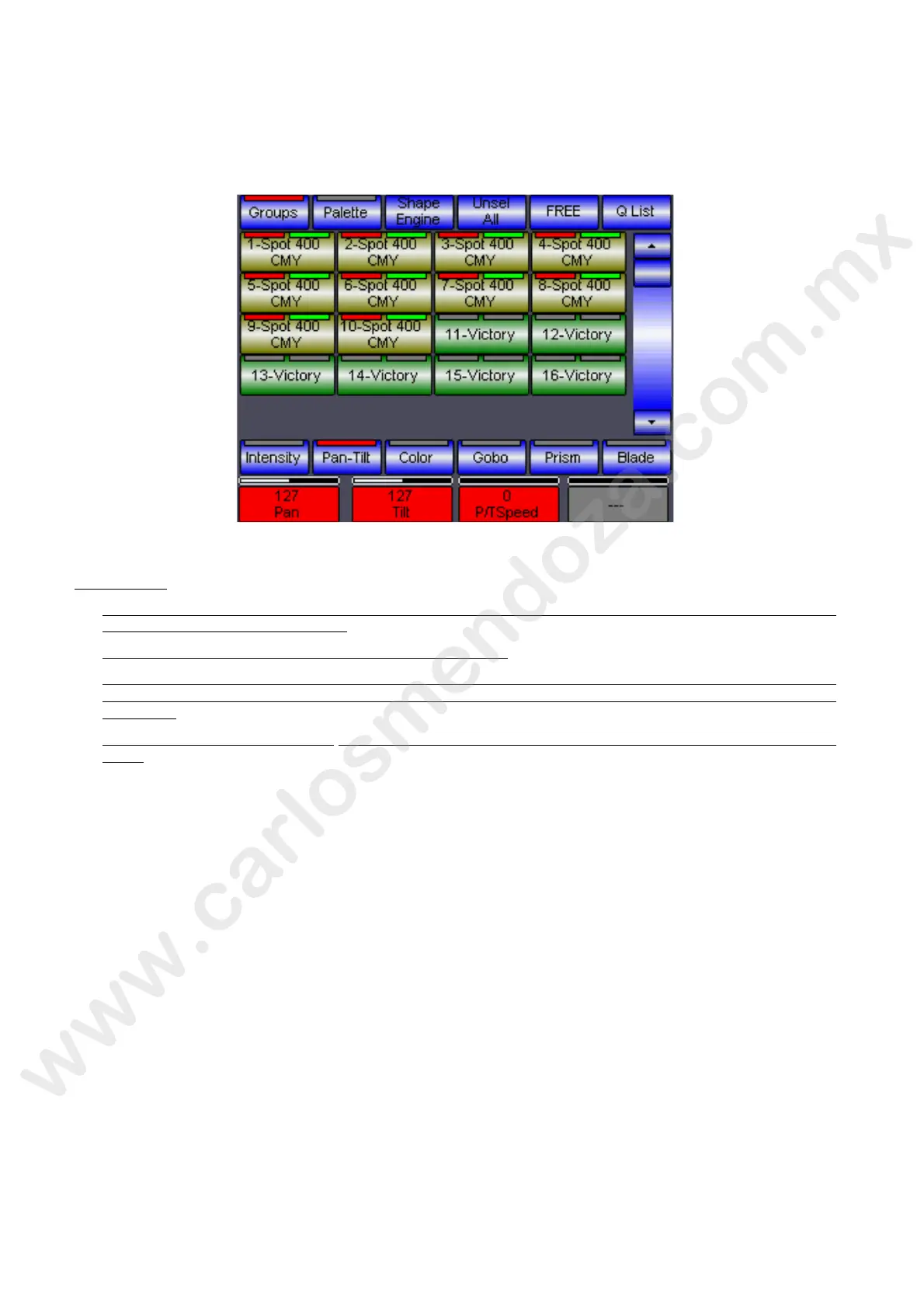visualize all of them, simply press the Palette keys, located above the red fields, Intensity, Pan Tilt, Color,