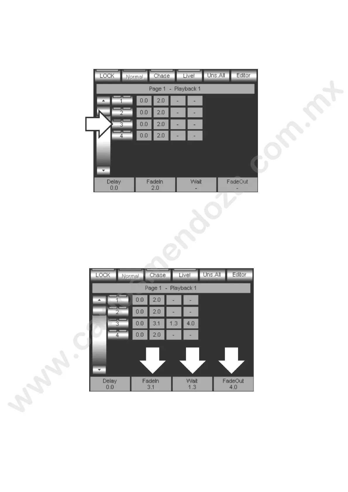 By means of the SELECT key, select the Playback register which co tains the Cue that needs a timing