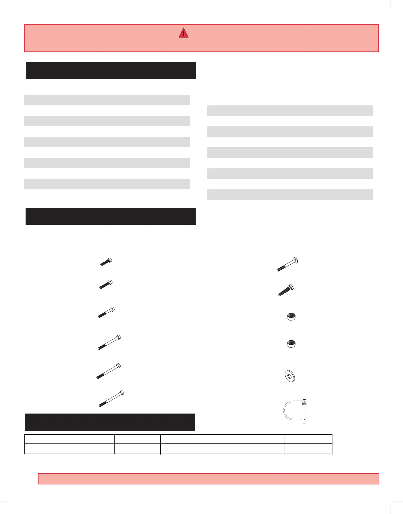 It is recommended to make sure you have all parts and hardware prior to assembly.