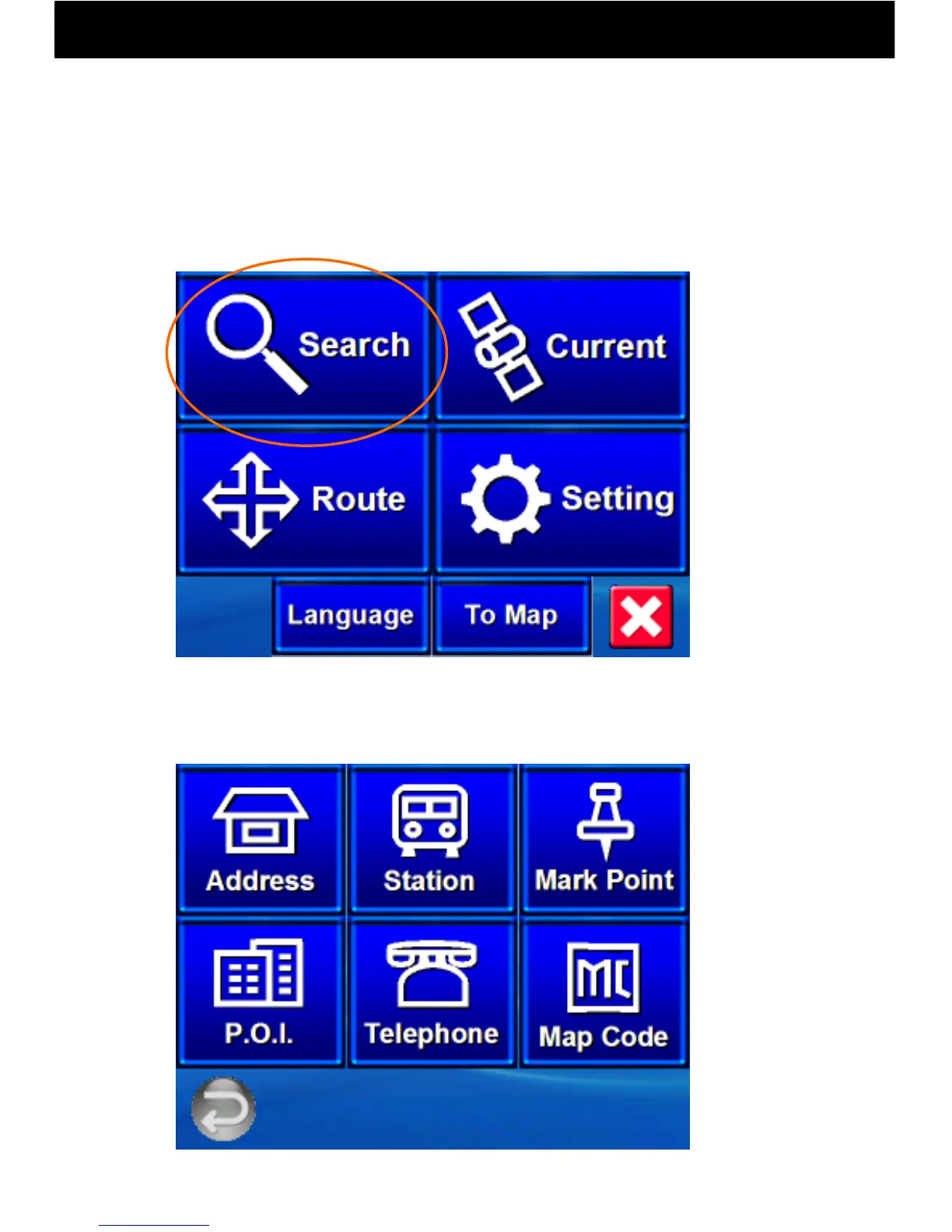 When Search is pressed on the Navi Top Menu, six sub-menus will be
