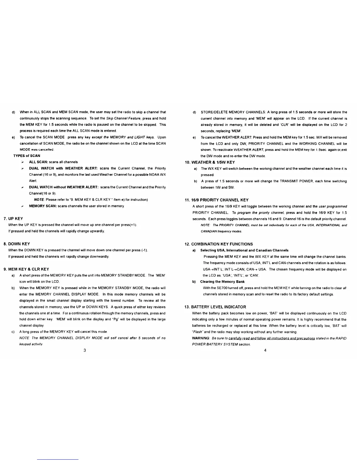 Shakespeare Electronic Model SE 700 - Memory and Clear Key; Store or Delete Memory; Cancel Weather Alert; Priority Channel Key