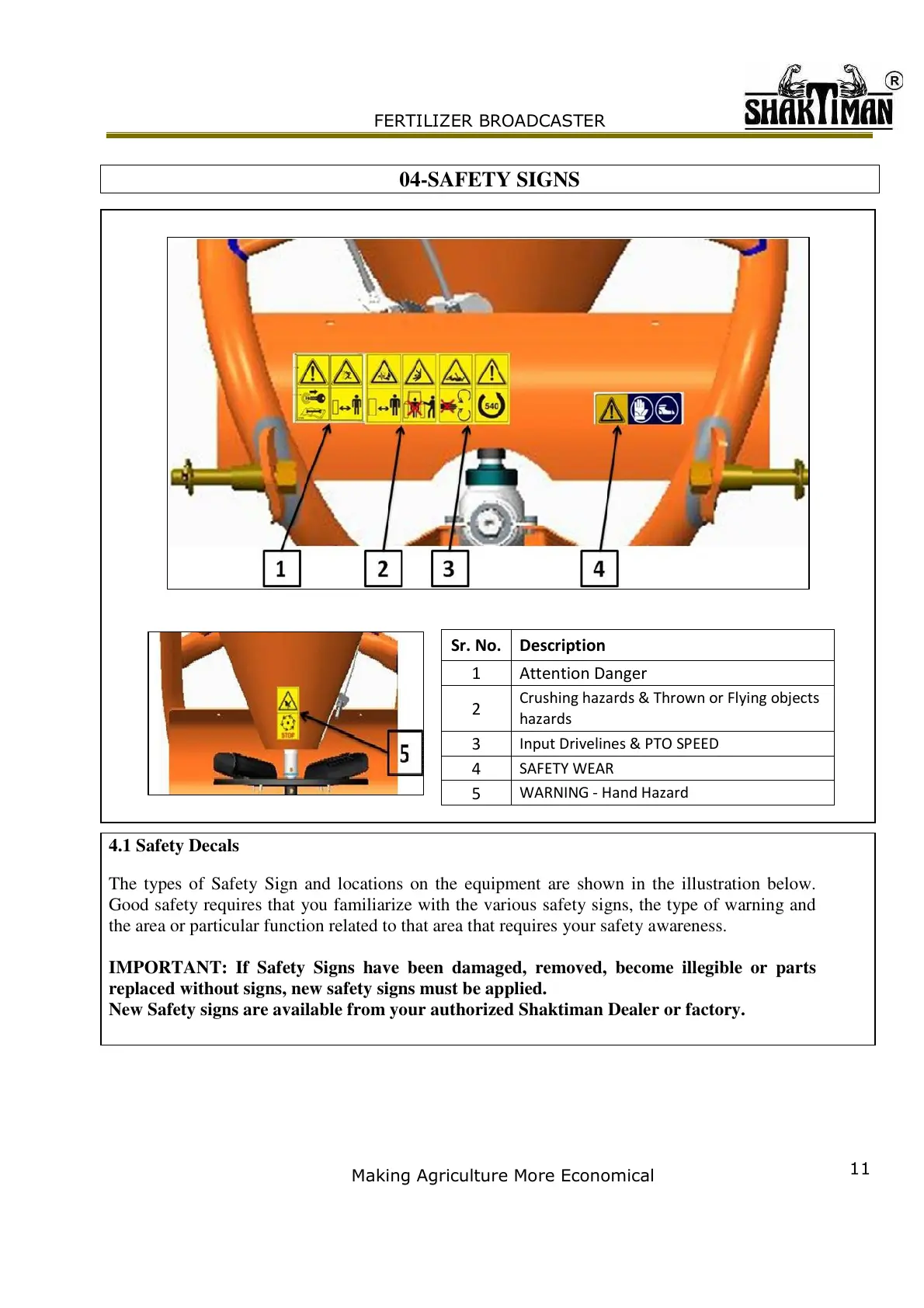New Safety signs are available from your authorized Shaktiman Dealer or factory.