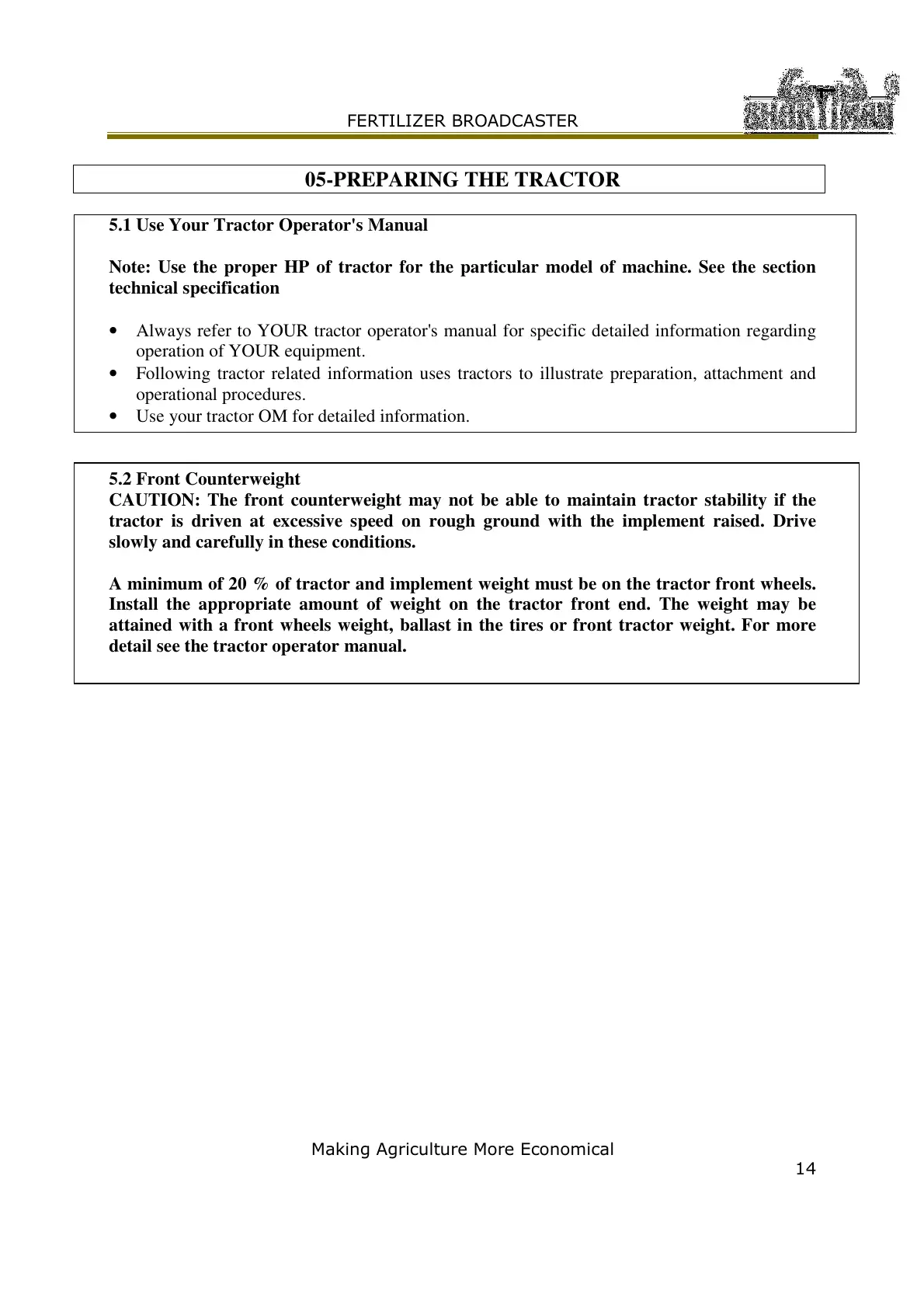 • Following tractor related information uses tractors to illustrate preparation, attachment and