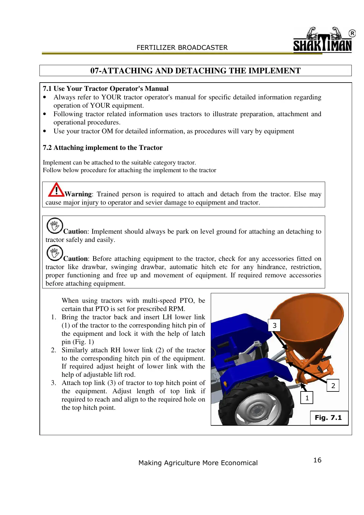 7.2 Attaching implement to the Tractor