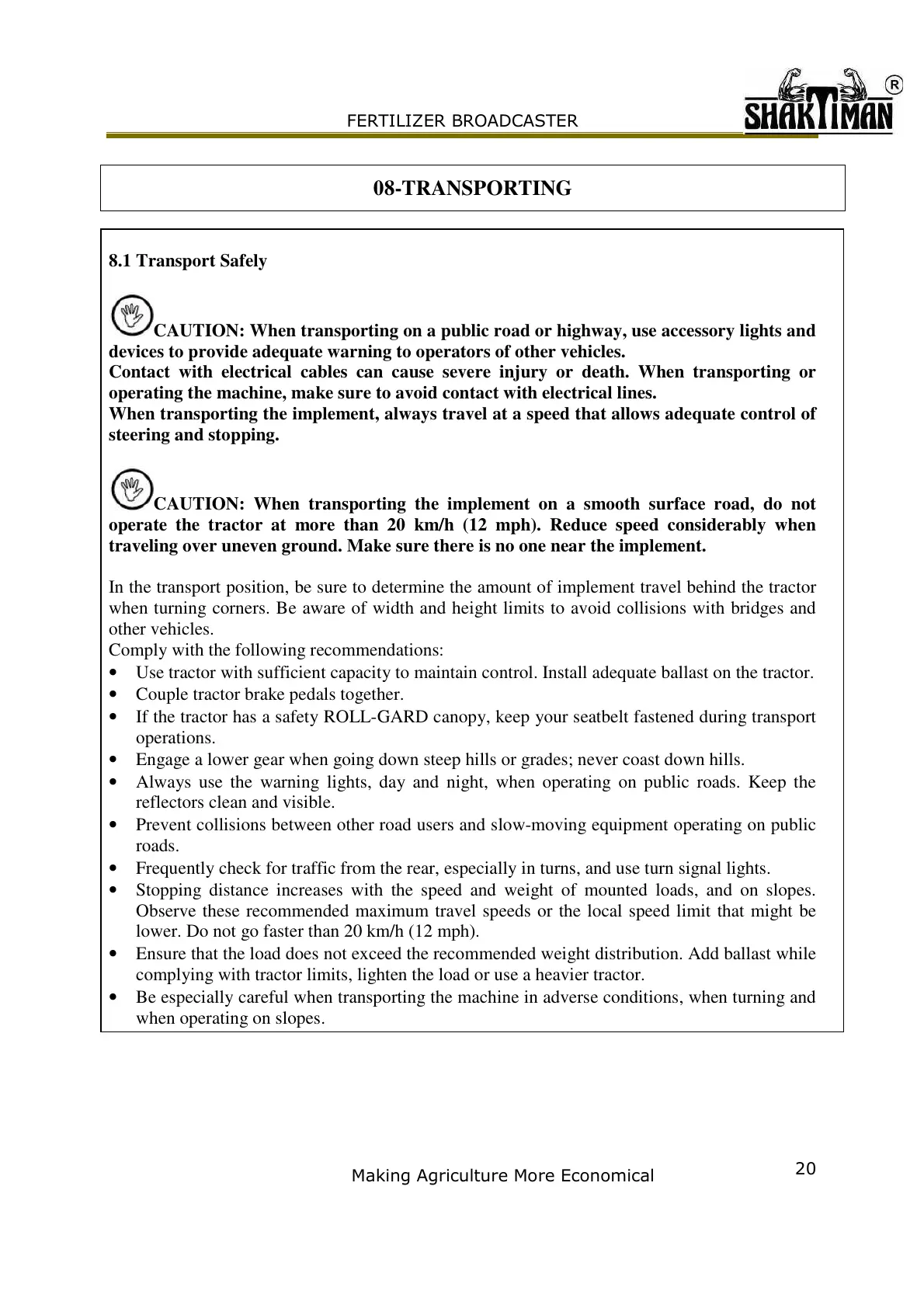 operate the tractor at more than 20 km/h (12 mph). Reduce speed considerably when