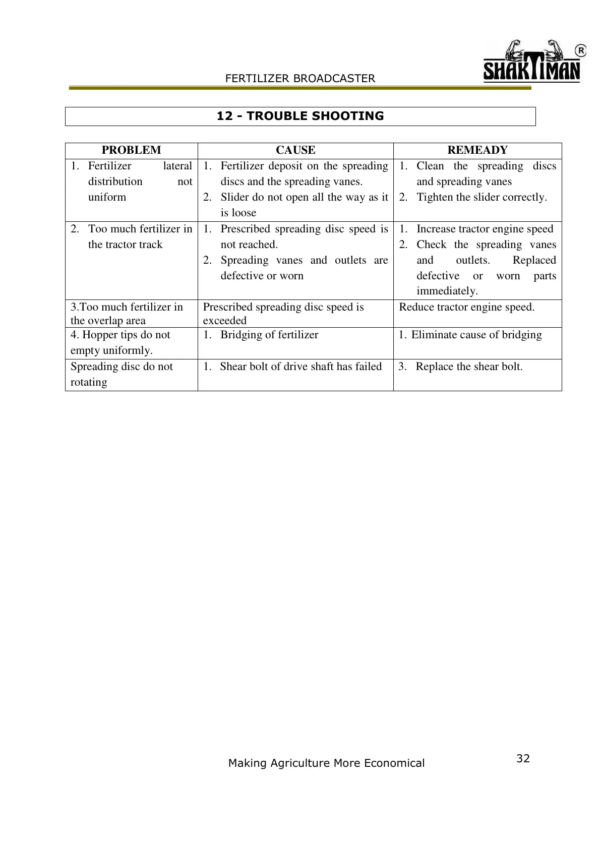 1. Bridging of fertilizer 1. Eliminate cause of bridging