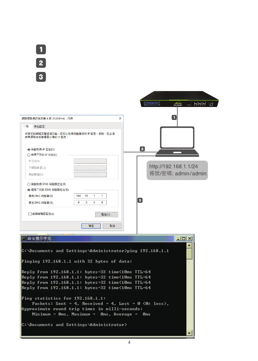 IP 取得後,於設定電腦上 Ping 192.168.1.1