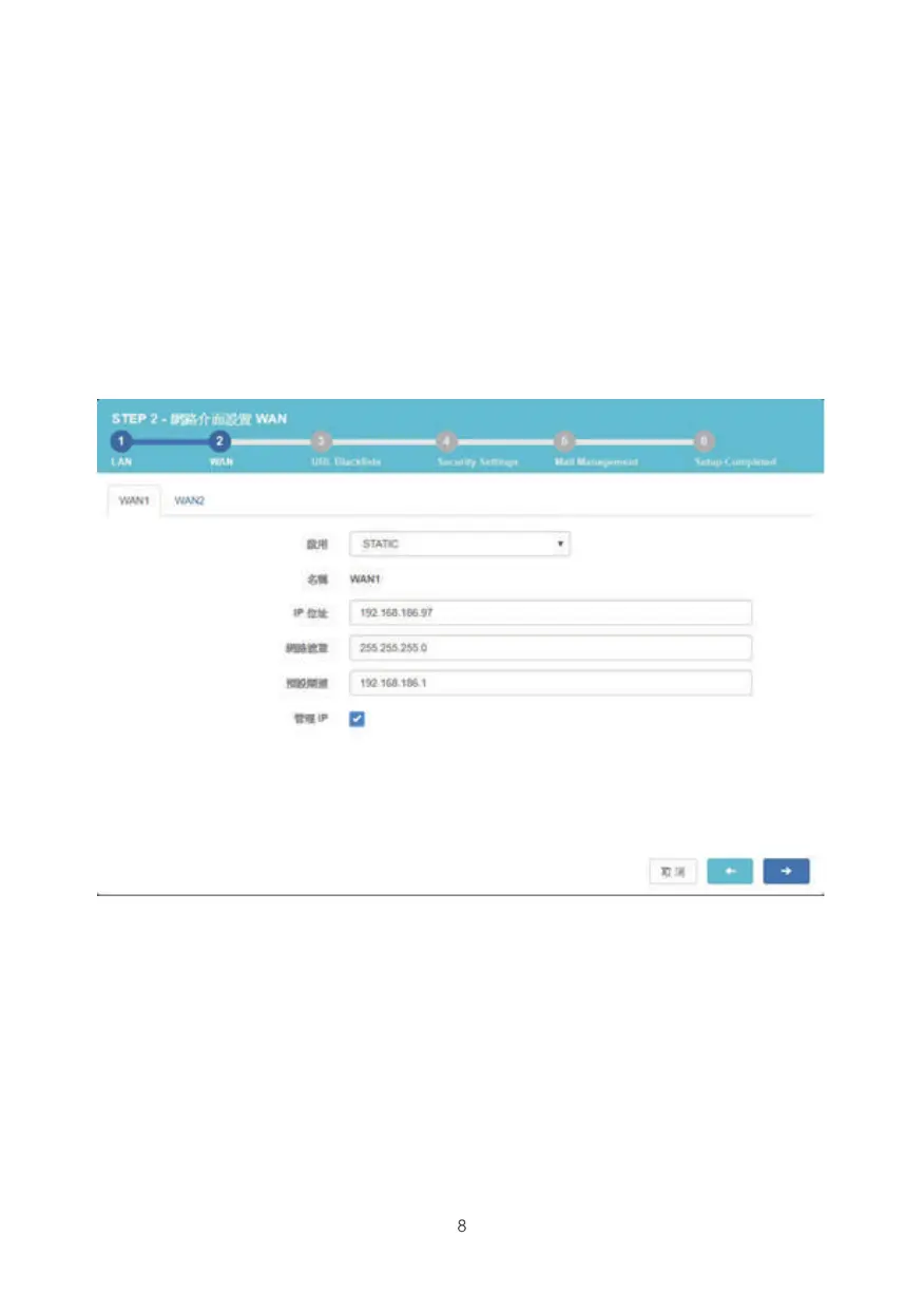 請按下箭頭選擇所需的連線模式,至少設定一個WAN才可繼續安裝精靈