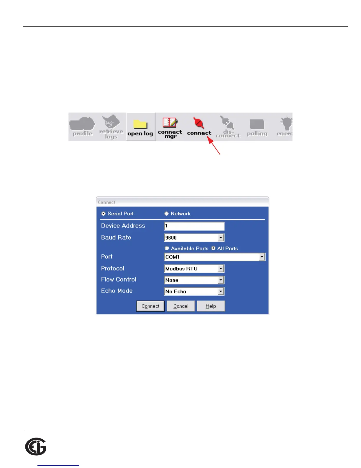 3. The Connect screen opens. If you are connecting via RS485, make sure your set-