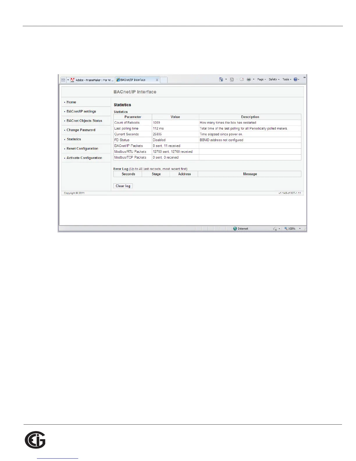 This page lists information and any Error log for the meter. To erase the Error log,