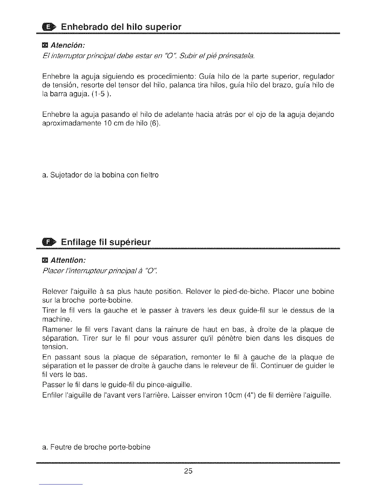 Enhebre ta aguja siguiendo es procedimiento: Guia hilo de ta parte superior, regutador
