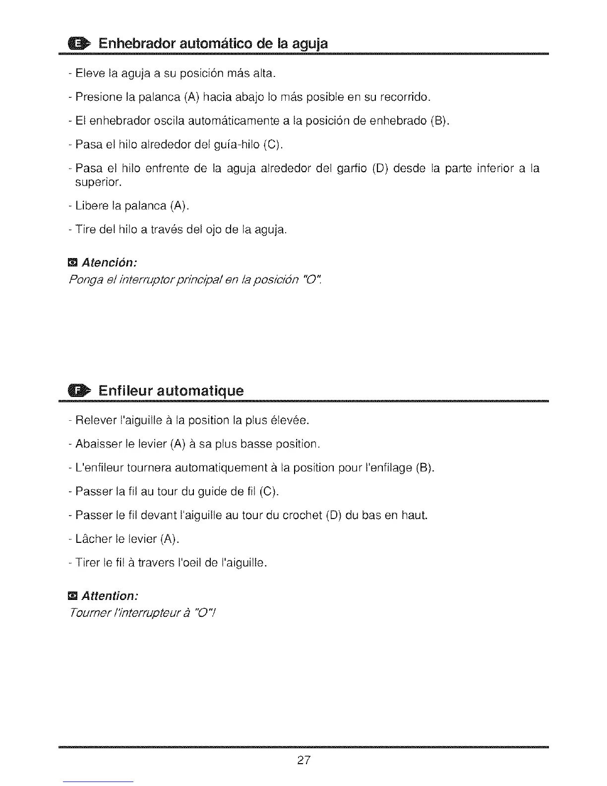 - Et enhebrador oscita autom_.ticamente a ta posici6n de enhebrado (B).