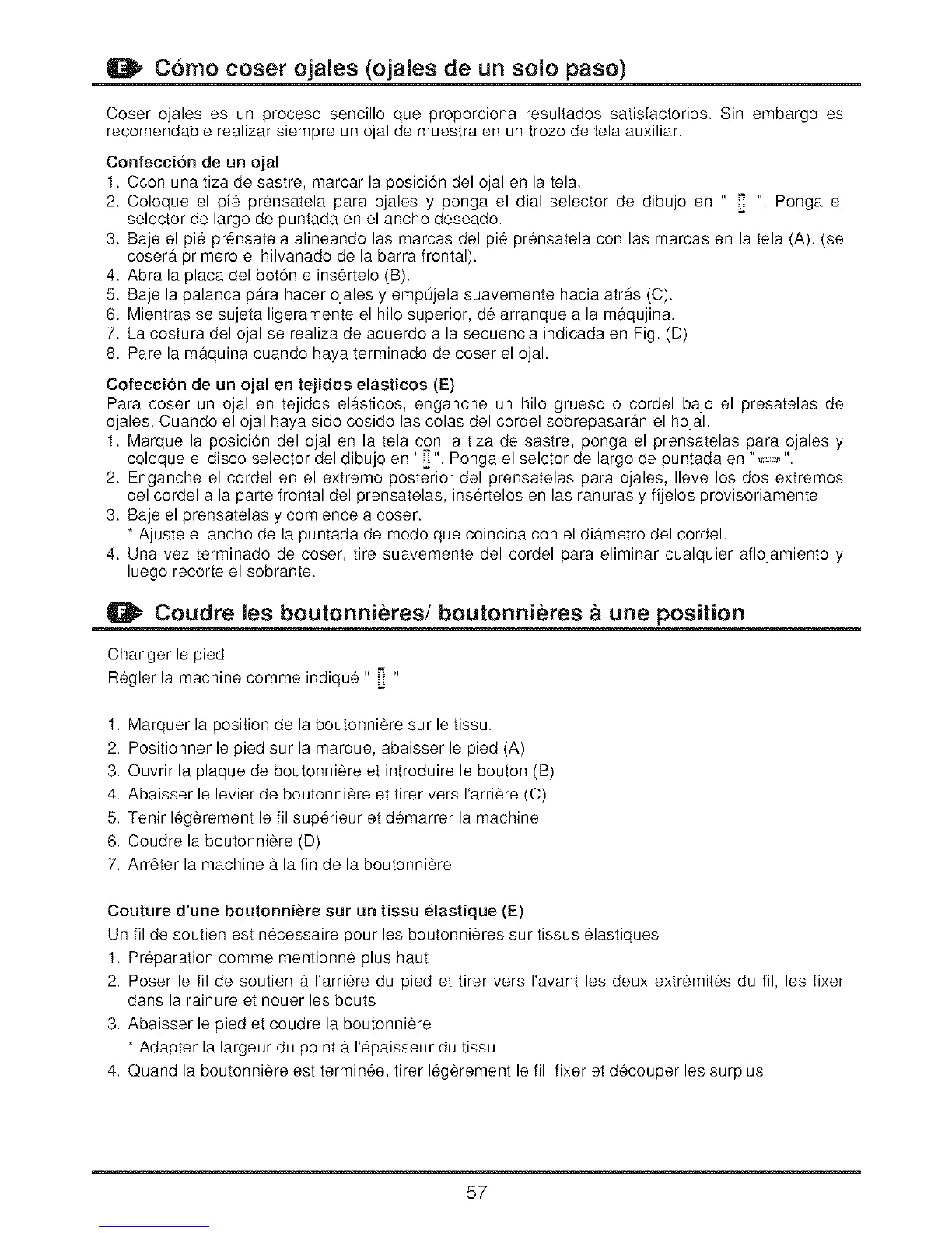 7. La costura del ojal se realiza de acuerdo a la secuencia indicada en Fig. (D).