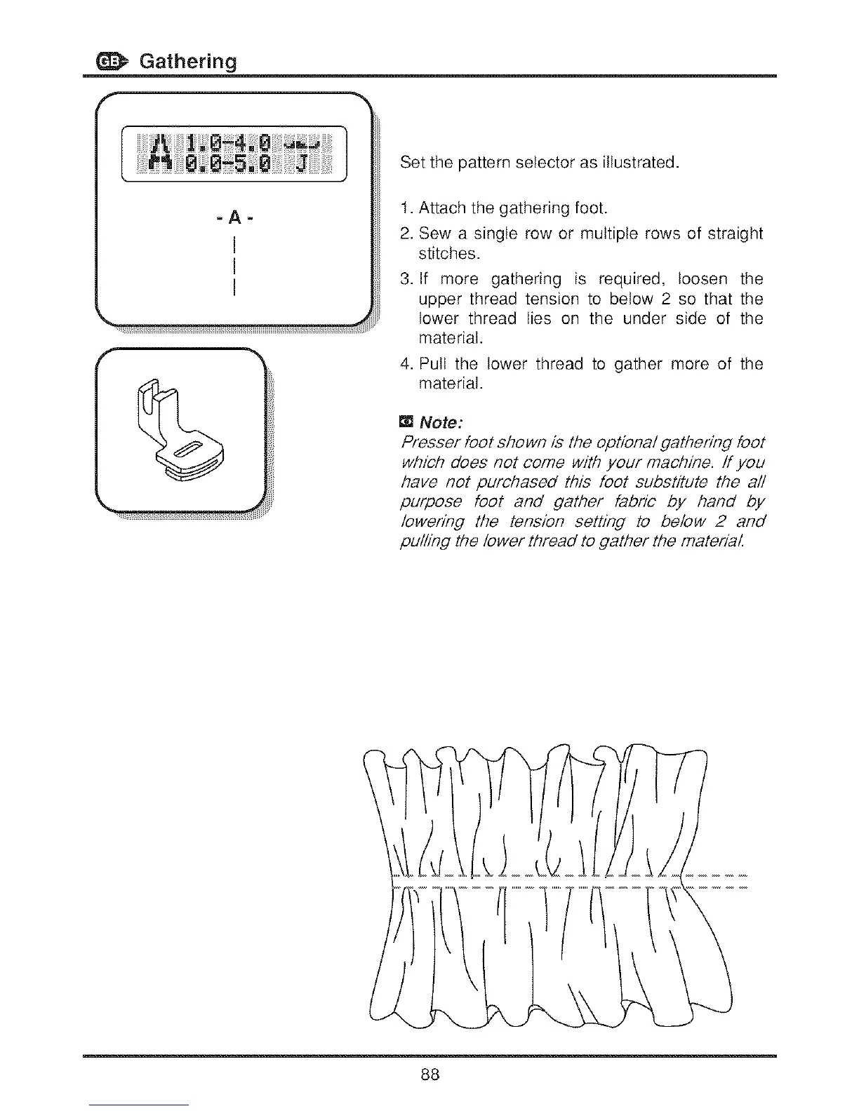 Presser foot shown is the optional gathering foot
